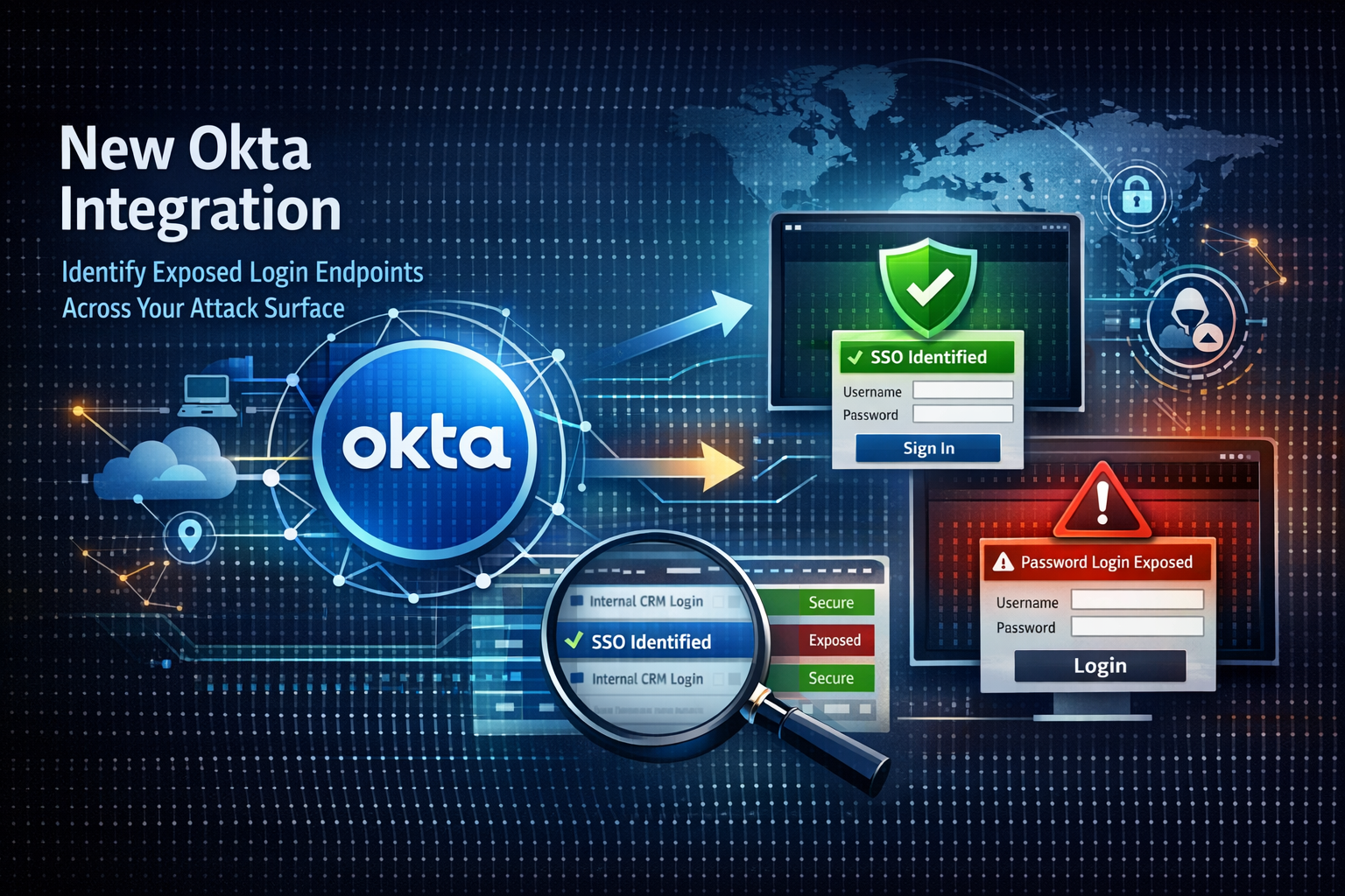 Unlike Okta SSO setup—which focuses on enabling single sign-on for your users—this integration connects directly to your Okta tenant to identify login endpoints across your attack surface that are exposed to the internet without SSO protection layered on top of them.